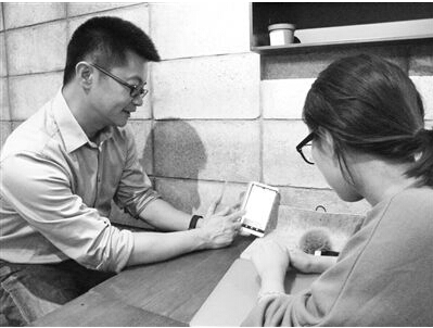 在接受采訪時,談健用手機軟件演示無鑰簽名技術。成怡昕攝