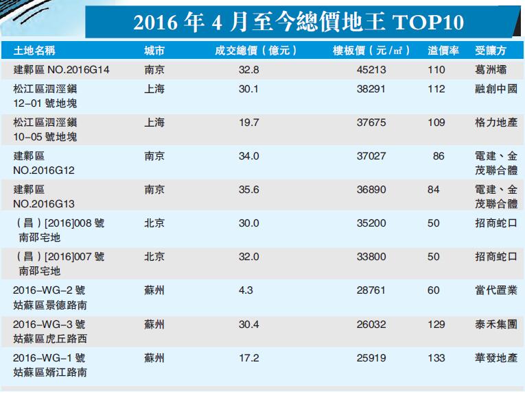 值得注意的是,和往年一線城市包攬「地王」的情形不同,今年「高單價、高總價、高溢價率」的「三高」地塊扎堆出現在廈門、南京、合肥、蘇州、杭州等一些熱點二線城市。如5月13日,南京一天拍出3個「地王」;昨天,杭州歷史上首宗百億地王「問世」。