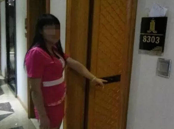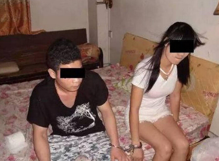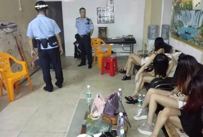 圖為被查現場,涉黃被抓女子均低頭,長發掩面。