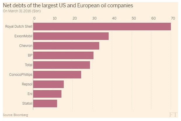對過去一年油企總債務“貢獻”最大的是荷蘭殼牌,舉債190億美元現金收購英國天然氣集團。此外,埃克森美孚凈負債由276億美元增長到383億美元,BP石油由246億美元增長到306億美元。