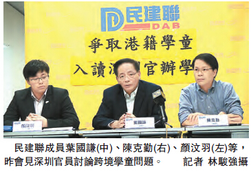民建聯代表團包括港區人大代表葉國謙、該黨副主席陳克勤、青年民建聯主席顏汶羽、北區區議員劉國勳等,昨日下午與深圳教育局官員商討跨境學童問題;接見代表團的深圳官員包括深圳市教育局副局長范坤、深圳市教育局處長彭堯,以及深圳市口岸辦、邊檢總站辦公室及港澳辦等。