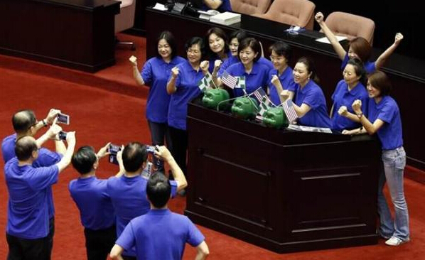 據中評社報道,藍委更比照綠委在野時的問政火力,把一個大豬公模型抬進議場,還在豬臉頰畫上眼淚,臺下有女綠委回嘴“這不是在虐待豬嗎?”藍綠頓時笑成一團。