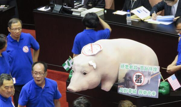 豬農為抗議政府有意開放含萊克多巴胺美豬進口,上午集結在立法院外。