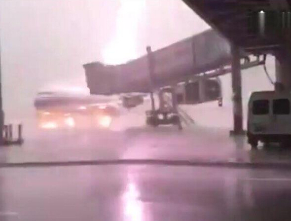昨日下午2時許,揭陽潮汕機場遭遇一場突如其來的強雷雨,南航汕頭公司一架航后停場飛機被雷電意外擊中。事發時的現場視頻可見,停機坪上風雨交加,雷聲陣陣,一輛白色客機正停在機場停機坪處,約100米外還有一名工作人員站在一輛面包車旁。