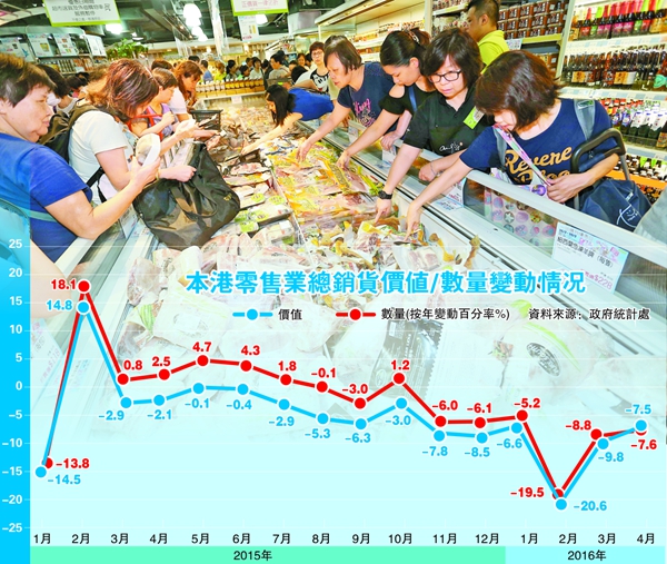 【香港商報網訊】記者莊海源報道:本港零售連跌14個月!昨日,政府統計處公布零售業最新數據,4月份,零售業總銷貨價值臨時估計為352億元,較去年同期下跌7.5%,較3月跌幅收窄2.3%;零售業總銷貨數量下跌7.6%,較3月跌幅收窄1.2%。其中,以雜項耐用消費品跌幅最大,下跌超過31%;電器及攝影器材下跌23%,珠寶首飾、鐘表及名貴禮物下跌超過16%。同日,旅發局亦公布4月本港整體旅客人數按年微跌2.1%,其中內地旅客人數跌幅收窄至減少4%。今年首4個月訪港游客跌8.8%,其中內地客跌12.6%。