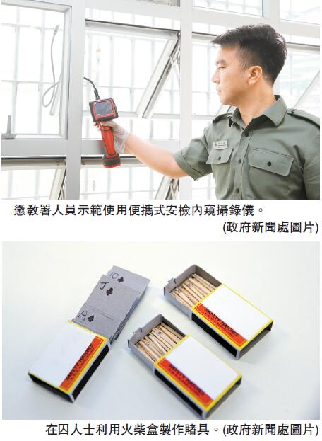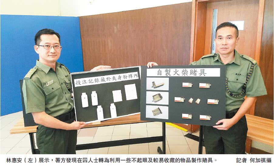 他們又指,在打擊賭博活動下,在囚人士會轉為利用一些不起眼及較易收藏的物品來製作賭具,及把賭具及投注紀錄收藏在更隱蔽的地方。署方在透過情報收集及仔細搜查下,仍發現相關違禁品,今年則發現有在囚人士利用派發給他們作點煙用的火柴來製作賭具,包括製成牌九、啤牌,或在火柴畫上數字作「雀寶」賭具;而收藏違禁品的地方包括在囚人士的制服,甚至一般日用品,如爽身粉樽內。