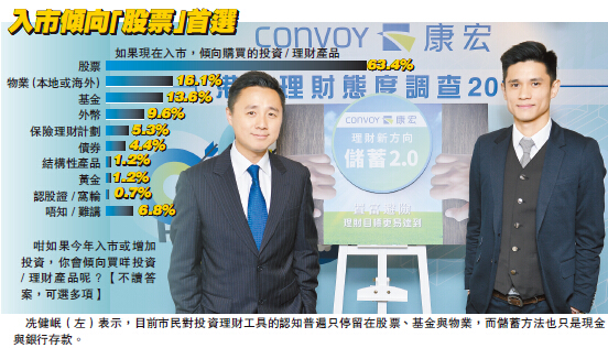 康宏理財服務行政總裁冼健岷表示,目前市民對投資理財工具的認知普遍只停留在股票、基金與物業,而儲蓄方法也只是現金與銀行存款,投資及儲蓄態度不合時宜,難以抵御未來經濟變化。