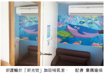 新渡輪為旗下行走兩條離島主要航線的3層普通渡輪「新光號」豪華客艙,引入「渡『嚐』空間」計劃,於船上建造哺乳室,佔地約4.6平方米的哺乳室將於明日起正式投入服務,配套設施如空氣調節、梳化、更換尿片軟墊、洗滌槽等齊全,需要使用哺乳室的乘客,只須於登船前在碼頭通知碼頭主管或上船後直接聯絡船員便可獲安排使用哺乳間。
