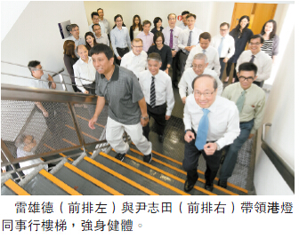 每天都在公司行樓梯鍛煉身體的港燈董事總經理尹志田分享稱,「港燈中心樓高12層,不說大家不知道,一共有288級樓梯。我平日大約用3分半鐘就可以由地面行到12樓,平均1分鐘行3層半,十分輕鬆。多行樓梯可讓大家有機會走動,是一項既簡單又有益身心的運動,兼且可以減排節能、保護環境,實在是一舉兩得。」
