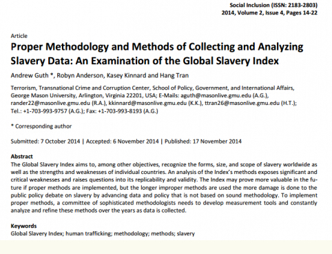 2014年,美國喬治梅森大學的四名學者發表題為《收集和分析奴役數據正確的方法論及研究方法:對全球奴役指數的檢測》(Proper Methodology and Methods of Collecting and Analyzing Slavery Data: An Examination of the Global Slavery Index)。論文認為,從對“現代奴役”的定義到數據的收集分析,WFF的定量分析都具有“顯著”且“嚴重”的不足,因此該報告的有效性和可靠性均大打折扣。
