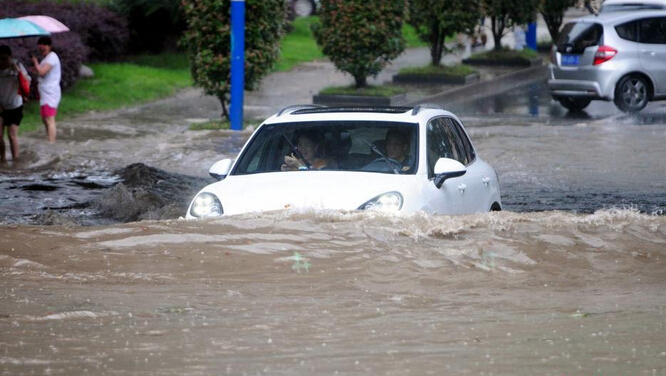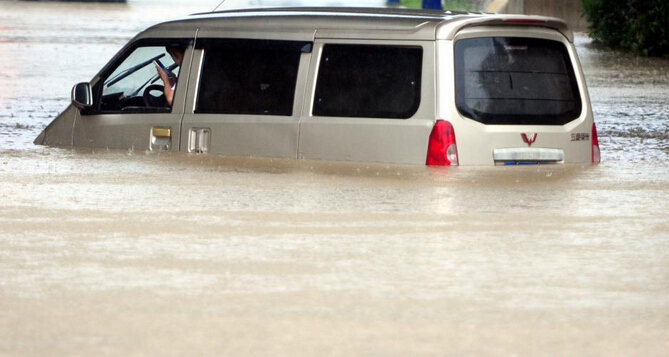 6月1日,車輛在江西九江市街頭積水路段勇往直前。