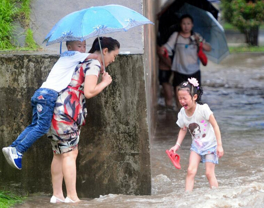 6月1日,市民在江西九江市街頭冒雨淌水前行,一位小女孩被嚇哭。