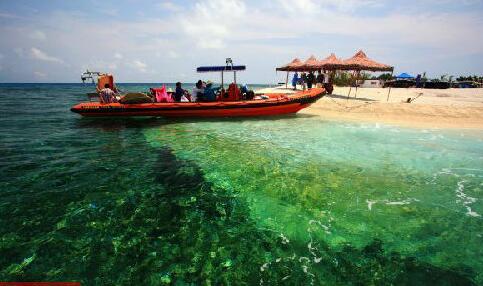 一艘小船停靠在中国南海西沙群岛水域。新华社发