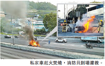 昨日清晨6時38分,肇事私家車沿呈祥道左三線往荃灣行駛,至荔枝角公眾泳池對開時疑因切線導致撞向一輛空載旅遊巴右邊車身,私家車隨即失控打「白鴿轉」,再撞向石壆始反彈停在快線,車頭毀爛,私家車上姓李女司機(40歲)一度呆坐車廂,及後自行下車,被旅遊巴士姓何男司機(34歲)扶往旅巴上休息,約5分鐘後,私家車突告火焚燒,瞬間陷入火海,濃煙直捲半空。