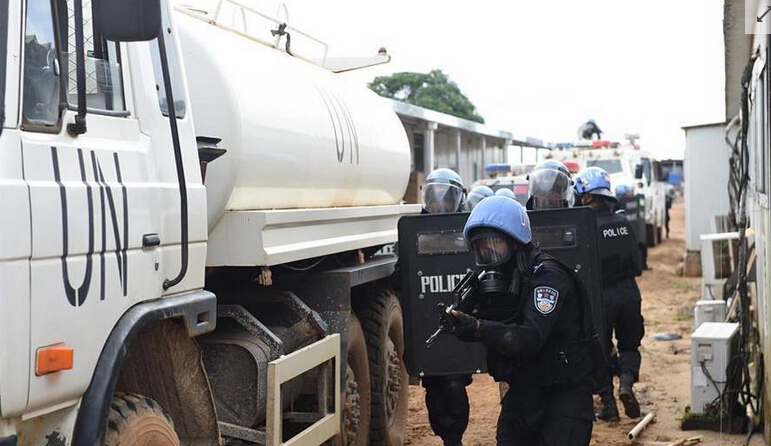2016年6月1日,中國第四支駐利比里亞維和警察防暴隊應急處突分隊依托裝甲車,組成防暴處突隊形,進行掩護推進。