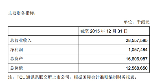 公告稱,TCL通訊已發行總股本為1,271,559,034股,每股面值為1元港元。截至2015年12月 31 日,TCL通訊主要經營情況如下:
