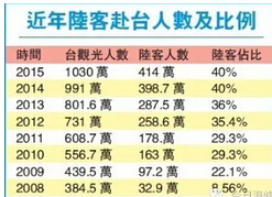台湾“经济研究院”景气预测中心主任孙明德:假设陆客1年减少100万人次,以有关统计陆客平均日消费232美元、平均消费6至7日来看,今年恐怕台湾少赚450亿元新台币的观光收入,对GDP会造成0.32个百分点的冲击。