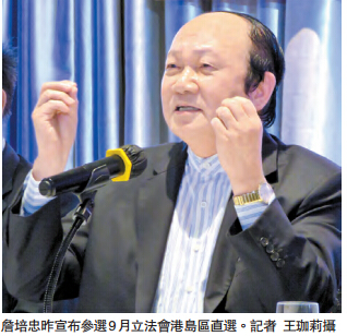 【香港商报网讯】记者王珈莉报道:立法会前金融服务界议员詹培忠,宣布参选9月立法会港岛区直选。他表示,曾有人用好难听的说话劝他退选,他表明自己参选不为名利、无私心、无畏惧,希望再次晋身立法会为香港人讲真话。