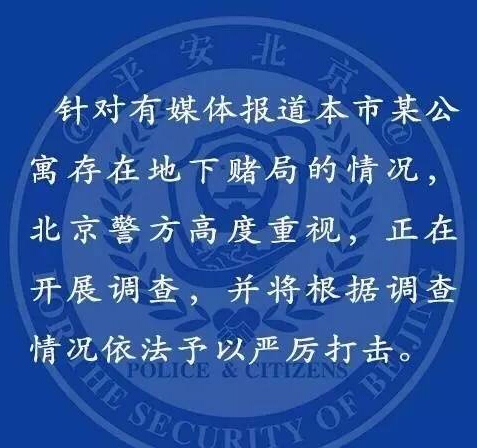 6日一早,北京公安局官方微博@平安北京發布消息稱,“針對媒體報道本市公寓存在地下賭局情況,北京警方高度重視,正在開展調查,并將根據調查情況依法予以嚴厲打擊”。