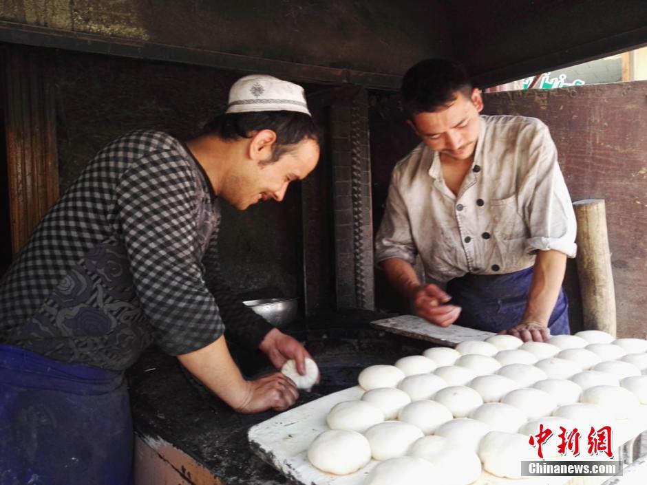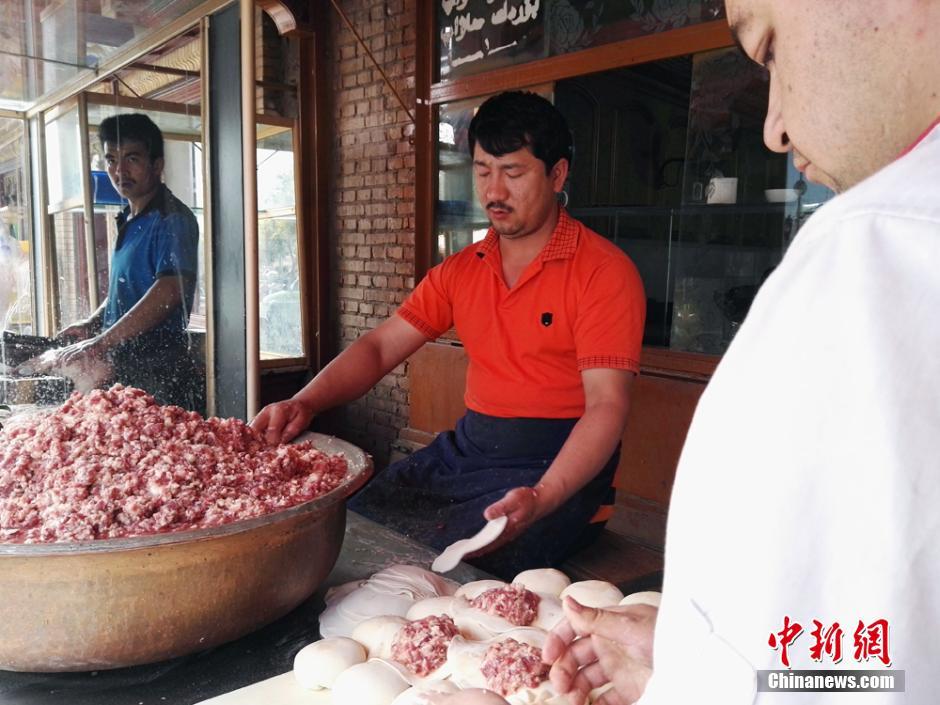 新疆喀什噶爾老城核心區包括四個街道辦事處的上百條街巷,面積3平方公里,生活著26575戶居民,他們中很多人是匠人,從事著坎土曼制作、陶器制作、花帽制作等古老行業,維持生計,傳承著千年技藝。圖為阿迪力(右一)與同事一起剁好肉餡放入佐料,開始包包子。 王小軍 攝