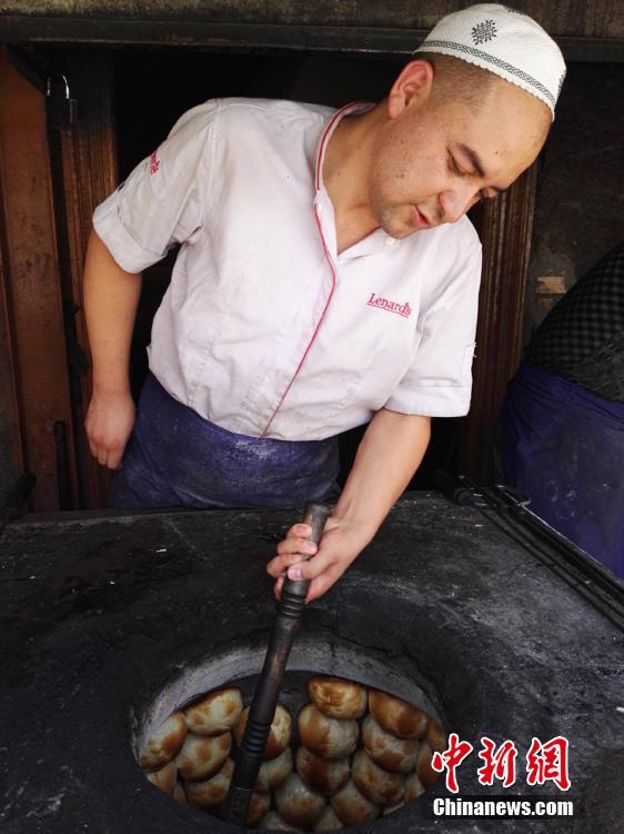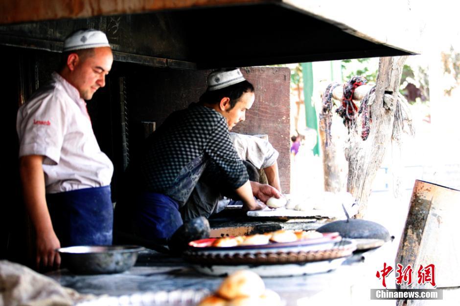 新疆喀什噶爾老城核心區包括四個街道辦事處的上百條街巷,面積3平方公里,生活著26575戶居民,他們中很多人是匠人,從事著坎土曼制作、陶器制作、花帽制作等古老行業,維持生計,傳承著千年技藝。古老烤包子店里員工分開明確,圖為兩小伙子專門往馕坑里放包子。 王小軍 攝