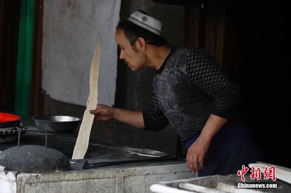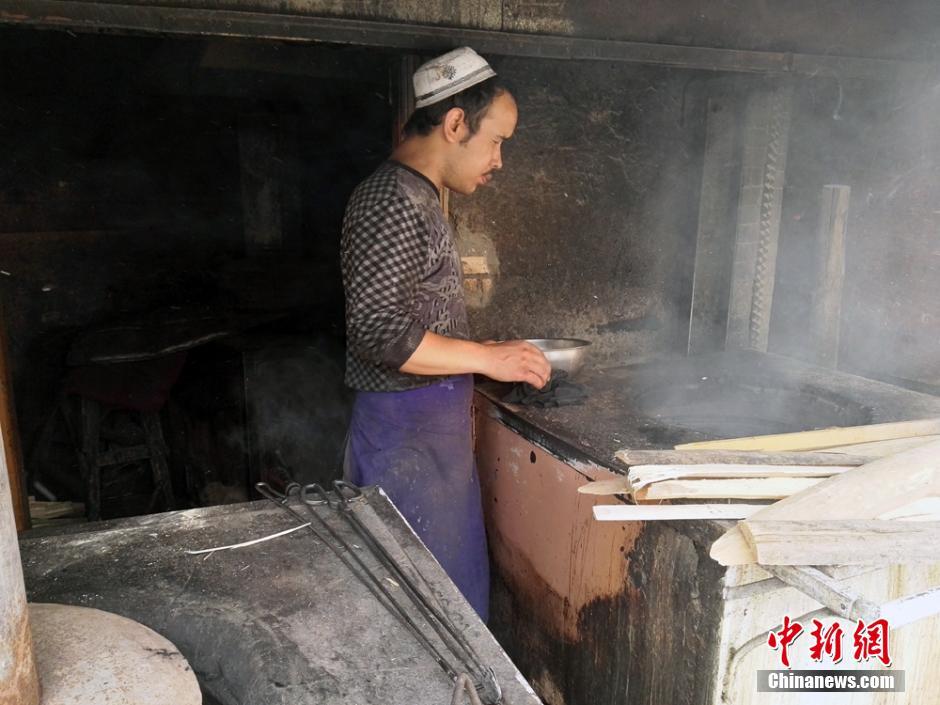 新疆喀什噶爾老城核心區包括四個街道辦事處的上百條街巷,面積3平方公里,生活著26575戶居民,他們中很多人是匠人,從事著坎土曼制作、陶器制作、花帽制作等古老行業,維持生計,傳承著千年技藝。圖為早晨不到十點,古老烤包子店員工就開始忙碌起來,小伙子為馕坑生火。 王小軍 攝