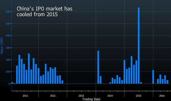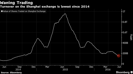 北京時間7日訊 猶記得中國股市2015年年初紅紅火火的時候,失調的經濟從金融服務業得到了難得的刺激。可是短短一年間,情勢已經發生了巨大的變化。彭博報道稱,股票交易流量下滑了80%之多,而IPO企業數量縮減65%。于是乎,在出口市場需求疲軟,鋼鐵和煤炭產能過剩之外,金融行業的困境也成為了經濟增長的新拖累。