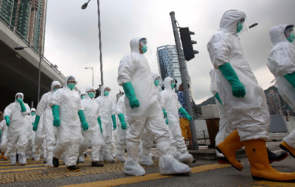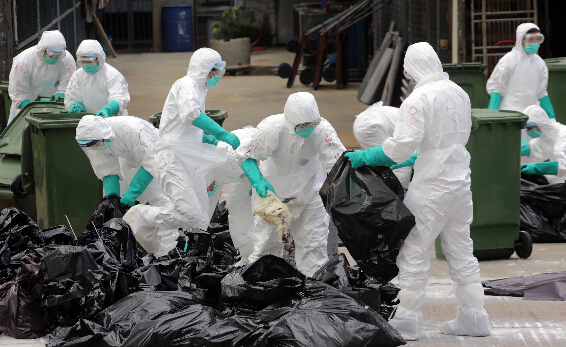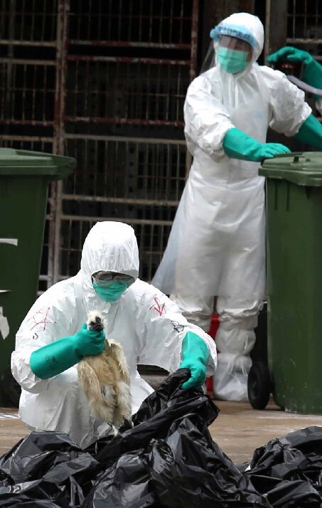 6月7日上午,香港渔护署人员穿上全套白色保护衣物到长沙湾临时家禽批发市场,销毁存放的4000多只活家禽。日前,香港屯门仁爱街市一个鸡档内有禽鸟粪便样本验出带H7N9病毒后,香港特区政府召开跨部门会议,决定继续暂停活鸡供应。