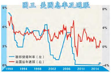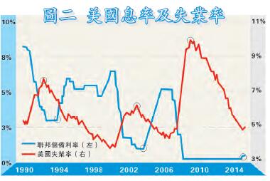 聯儲局加息與否主要看兩大指標,分別是失業率及通脹。再用上文的數時間距方法,圖二見到,1990年至今失業率經歷過三次回落期,第一次在1992年中見頂,聯儲局則在1994年1月加息,相距年半;第二輪在2003年中於高位回落,聯儲局於一年后的2004年5月加息。至於金融海嘯后的失業率在2009年10月見頂,但足足6年后的去年12月才加息,夠誇張了吧?