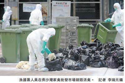 昨晨9時許,漁護署派出42名職員到長沙灣臨時家禽批發市場,銷毀市場內5600多隻活家禽,包括48隻本地雞、2000隻竹絲雞、825隻雉雞、600隻石雞及2170隻鴿。工作人員穿上白色的保護衣物、面罩、口罩及手套等,將雞籠一個個搬離批發商檔口外的空地,再逐隻家禽放入大型垃圾桶內,隨即灌入二氧化碳將牠們焗死,之後按既定程序棄置,包括用夾斗車將一袋袋的雞屍夾走,運往堆填區棄置。