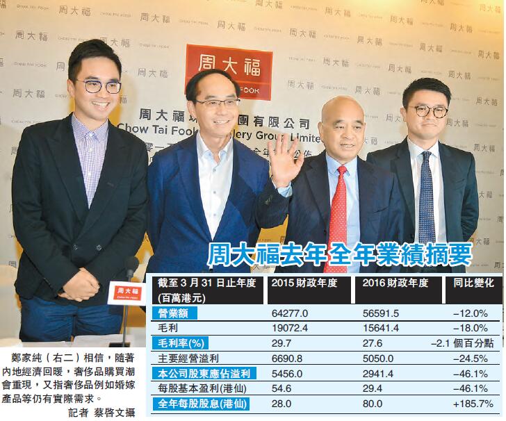 周大福截至3月底止,2016年財政年度營業額565.91億元,按年下跌12%。主席鄭家純表示,主要是消費意欲持續疲弱,美元升值令內地旅客轉往其他海外旅游目的地消費。內地珠寶業對營業額的貢獻增長至56.3%,但同店銷售仍跌10.3%;港澳及其他市場的營業額貢獻減少至39.2%,港澳地區的同店銷售增長更大跌21.7%。公司建議,派發末期息及特別股息分別為每股8港仙和22港仙,全年派息比率54.4%。