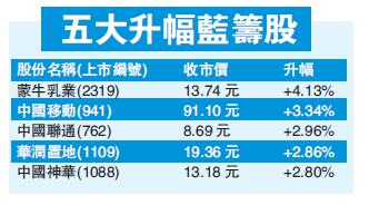 重磅藍籌昨領漲,中移動(941)升3.3%,成為升市火車頭;控(005)升1.5%;友邦(1299)升1.1%;騰訊(700)升1.6%,四股貢獻大市139點。中資金融股向好,國壽(2628)、交行(3328)、工行(1398)及平保(2318)升約2%。