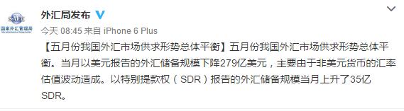 外管局官方微博今早評論稱,5月份我國外匯市場供求形勢總體平衡。當月以美元報告的外匯儲備規模下降主要是由于非美元貨幣的匯率估值波動造成。