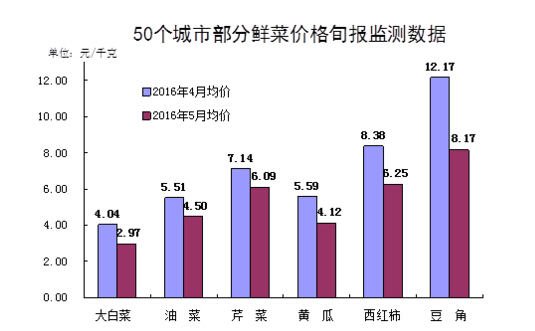 從環比看,CPI環比下降0.5%,主要是受鮮菜價格下降較多的影響。年初寒潮天氣襲擊我國大部分地區,影響了鮮菜的生產和運輸,鮮菜價格高位運行,較往年同期上漲較多。隨著應季鮮菜上市,市場供應逐步增加,鮮菜價格趨于正常。5月份鮮菜價格環比下降21.5%,影響CPI環比下降約0.64個百分點,超過CPI環比總降幅。從50個城市主要食品價格旬報監測看,蔬菜價格回落幅度較大,部分鮮菜價格下降幅度甚至超過三成。5月份豬肉價格環比繼續上漲,漲幅為2.3%,影響CPI環比上漲約0.07個百分點。國內成品油價格兩次提價,汽油、柴油價格環比分別上漲3.7%和3.8%,合計影響CPI環比上漲約0.06個百分點。