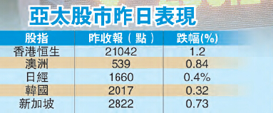 受沽空言論影響,亞太區股市昨天幾乎全線向下。受累於日圓匯率強勢,日經指數昨續跌0.4%,收報16601點;澳洲股市昨亦跌0.84%,最低見5294點;新加坡股市續吐0.73%,報2822點。歐洲英法德等主要股市早段平均跌幅在2%左右;道指期貨大跌逾100點,開盤即跌百餘點。