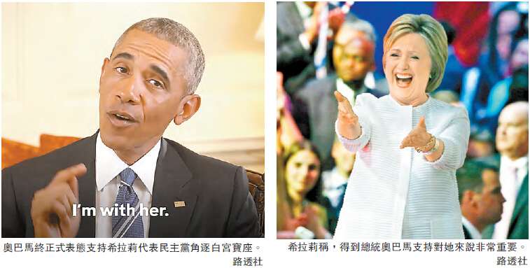 在兩人會面后,希拉莉競選團隊在推特公布奧巴馬的預錄影片,他恭喜希拉莉創造歷史,即將成為美國主要政黨首名女性總統提名人,正因他知道美國總統的職務毫不容易,他才了解希拉莉將會勝任此職位,揚言「我不認為有人比她更有資格掌管白宮」。奧巴馬盛贊,即使8年前民主黨初選中,兩人有激烈競爭,希拉莉在落敗后,仍答應出任國務卿,兩人在任內努力建立許多政績,并直言要讓大眾知道「我支持她」。希拉莉對奧巴馬投下信任票大表歡迎,在推特向對方致謝。