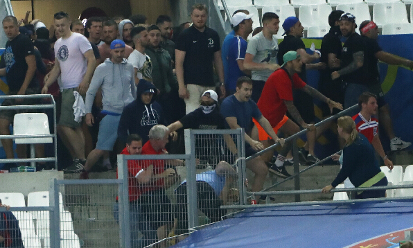 从11日下午4时开始,以俄罗斯和英国球迷为主的足球流氓相互挑衅,在被法国警方释放的催泪瓦斯驱散后,部分人“转战”临近街区。双方除了拳脚殴斗以外,还以啤酒瓶等物品为武器相互攻击。晚上8时左右,双方又在维罗德姆球场周边发生冲突。法国治安部队也成为攻击对象,被迫以催泪弹和高压水枪还击。
