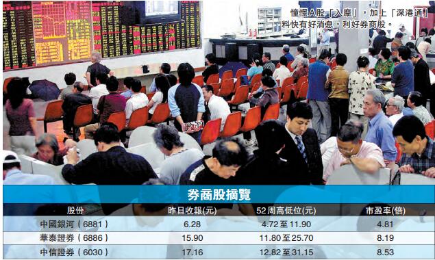 MSCI將在下周三公布內地A股能否成功納入指數內。由於這是A股第三次闖摩,市場傳聞,為推動MSCI納入A股,中央或祭出殺手「深港通」。事實上,近日券商股股價已經顯著做好,在MSCI和「深港通」雙利好下,市場預期券商股的股價仍有上升空間,中國銀河(6881)、華泰證券(6886)和中信證券(6030)尤可看高一線。