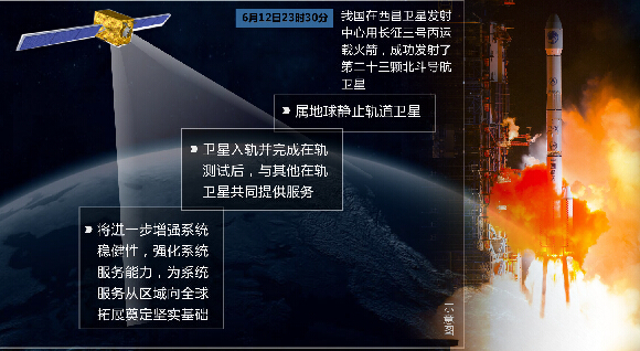 6月12日23时30分,中国在西昌卫星发射中心用长征三号丙运载火箭,成功发射了第23颗北斗导航卫星。