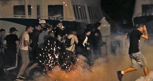 球場外的情況更為混亂,馬賽舊港口地區連日來成為球迷間的“戰場”,當晚有數百人聚集。英俄球迷在開賽前數小時已開始鬧事,警方一度使用催淚彈,但兩隊球迷之后再次上街鬧事,比賽期間更互相投擲桌和酒瓶等物品,警方再次出動催淚彈和水槍。當晚的沖突持續到第二天凌晨。