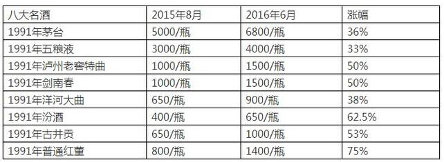 2016年,在很多收藏品價格紛紛下跌、一片蕭條的時候,在價格低谷徘徊了3年的老酒卻爆出了大冷門:從2015年8月起一直到現在,各種老酒的價格全面上漲。