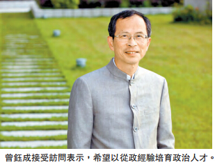 卸任议员之後,曾钰成说希望利用多年的从政经验,培育政治人才,继续为香港出谋献策。他认为香港缺乏政治人才:「回归之前,好多重大决定根本毋须公开谘询,在殖民地管治的时代,公务员队伍都是有效率的行政人员。」他认为回归之後情况不同,挑战是如何将政治理念落实为政策主张,争取支持,香港绝少这方面的人才,是因为过去根本不需要。