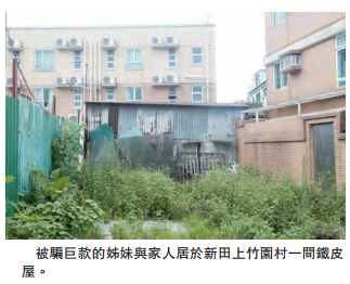 疑遭骗去360万元巨款的姊妹冼×珊(24岁)及冼×薇(26岁),两人与家人同住落马洲新潭路上竹园村一间没有门牌的铁皮屋。据悉,该对姊妹与父母及弟弟一家五口居於上址多年,但并非该村原居民,她们祖父多年前入住,父亲为三行工人,母亲於街市工作,弟弟已没读书正在待业,姊妹俩分别在甜品店及超级市场工作,妹妹早前已搬出自住。