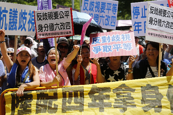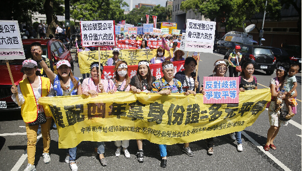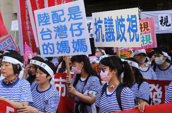 6月15日,台湾“中华两岸婚姻协调促进会”、“新移民劳动权益促进会”等多个民间团体在台北集会,呼吁将大陆配偶来台取得身份证明时间由六年改为四年。图为部分在台“立法院”外集会的陆配徒步前往民进党中央党部。