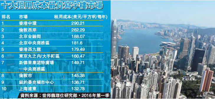 【香港商報网訊】記者曾浩榮報道:去年第四季以來,香港樓價踏入下行周期,大部分非住宅物業前景亦被看低一線,唯獨甲級寫字樓一直受追捧。世邦魏理仕研究部最新的半年度《全球主要寫字樓租用成本》調查報告更顯示,截至今年第一季,中環核心區已超越英國倫敦西岸,榮登全球「最昂貴寫字樓地段」,每年每平方呎租用成本(租金加當地稅項及服務費用)高達290美元,折算約2262港元。