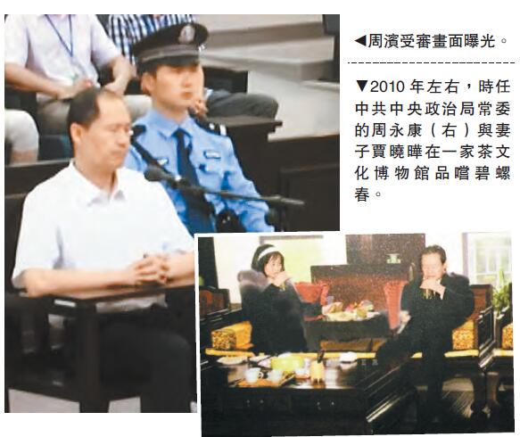 在周永康被执行无期徒刑满一年后,其妻和儿子几乎同步正式踏入各自的狱中生活。2015年5月22日,周永康案不公开审判的时候,法庭通过传唤证人吴兵出庭作证,播放周永康长子周滨、妻子贾晓晔作证录像。