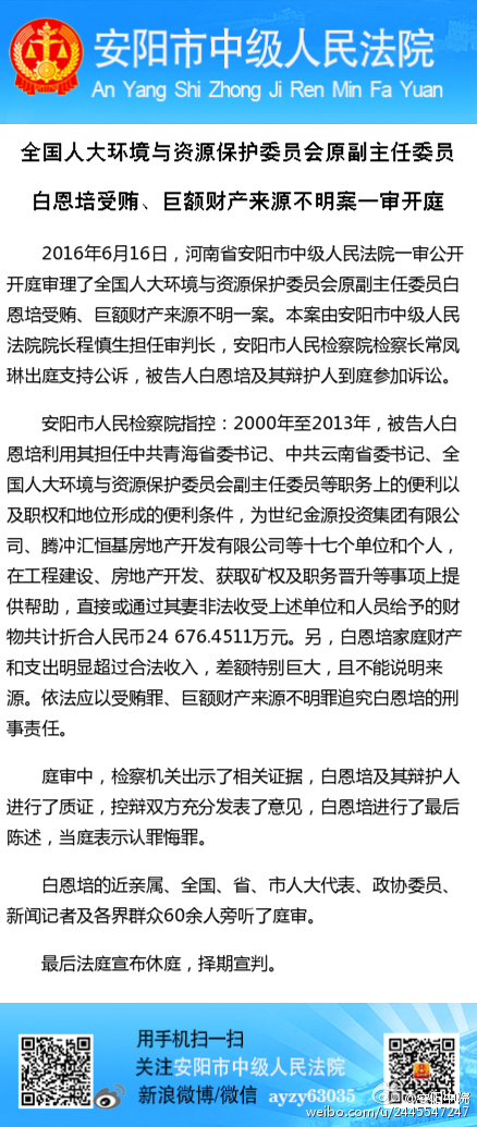 2016年6月16日,河南省安阳市中级人民法院公开开庭审理全国人大环境与资源保护委员会原副主任委员白恩培受贿、巨额财产来源不明一案。