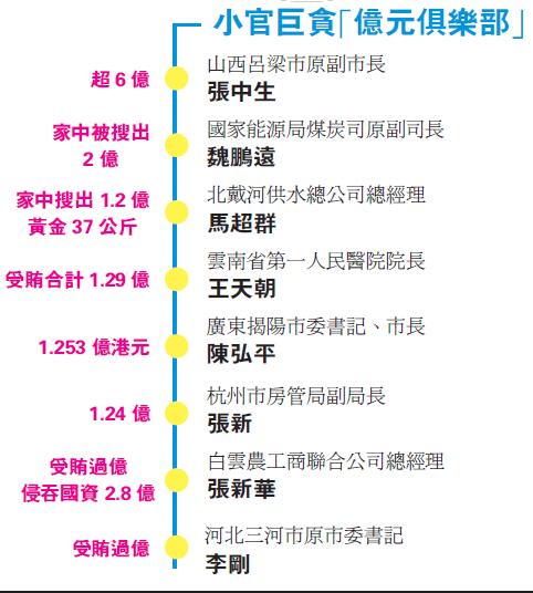 除了上述省部级以上的大老虎贪腐金额巨大以外,近两年来的小官巨腐更是让人目瞪口呆,不少厅局级及以下官员贪腐金额惊人,一些处级干部更是轻松的进入到「亿元俱乐部」(详见列表)。有分析认为,在密集走上审判席的同时,落马官员的贪腐金额无疑一次次冲击着人们的眼球,刷新着人们的三观。