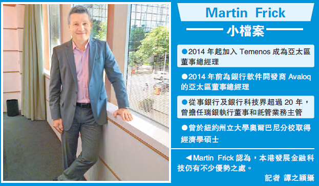 【香港商报网讯】香港近年積極發展金融科技(Fintech),但被指太遲發展,已被亞洲其他國家拋離。銀行IT軟件商Temenos亞太區董事總經理MartinFrick接受本報專訪時稱,香港的監管對比其他國家完善,擁有自己獨特的優勝之處。至於內地市場同樣看好,緣於內地銀行繼續昂首向現代和數碼化進發。香港商報記者譚之穎