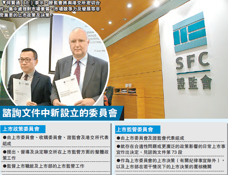【香港商報网訊】記者劉佳玲報道:證監會和港交所(388)聯合發布諮詢文件,建議設立「上市政策委員會」和「上市監管委員會」,改善港交所的上市監管決策及管治架構,港交所將保留上市職能。證監會企業融資部執行董事何賢通表示,證監會將與港交所密切合作,集中處理對市場質素、市場競爭力及發展等非常重要的上市政策及決策。